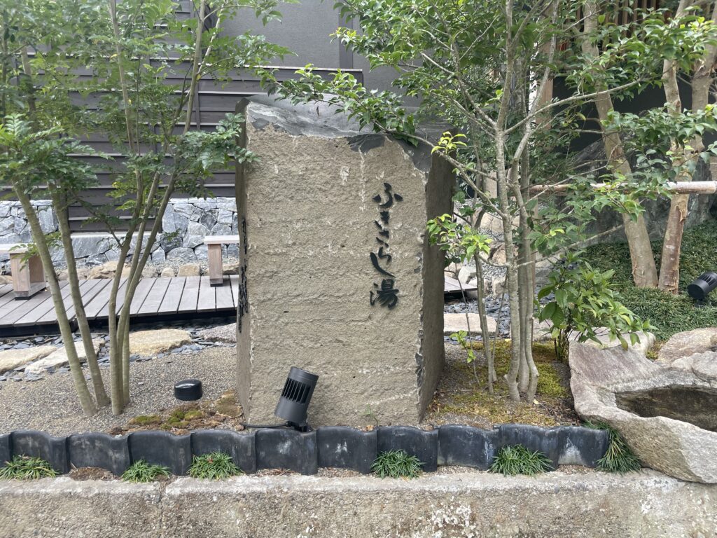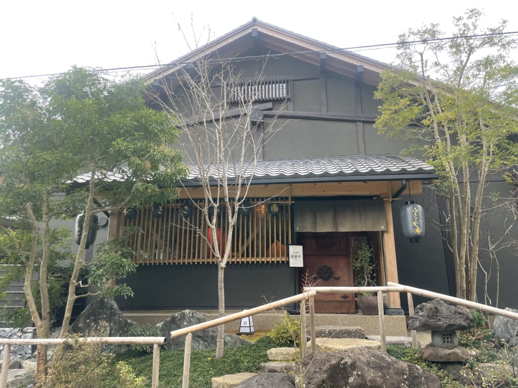 「ふきさらし湯」は、黒い外壁と木組みが特徴的な、モダンな建物です。
