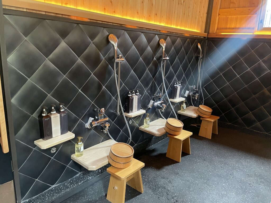 洗い場は黒いダイヤ柄のタイルが印象的で、とても清潔感があります。